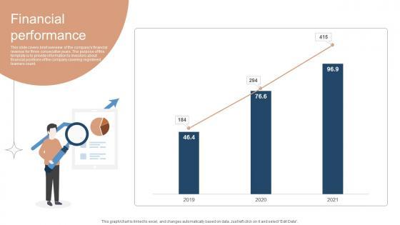 This slide covers brief overview of the companys financial revenue for three consecutive years. The purpose of this template is to provide information to investors about financial positions of the company covering registered learners count. Present like a pro with Financial Performance Investor Funding Elevator Pitch Deck For Online Learning Platform. Create beautiful presentations together with your team, using our easy-to-use presentation slides. Share your ideas in real-time and make changes on the fly by downloading our templates. So whether you are in the office, on the go, or in a remote location, you can stay in sync with your team and present your ideas with confidence. With Slidegeeks presentation got a whole lot easier. Grab these presentations today. This slide covers brief overview of the companys financial revenue for three consecutive years. The purpose of this template is to provide information to investors about financial positions of the company covering registered learners count.