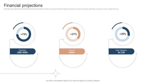 This slide covers information about future financial position of the company. The purpose of this templates provides an overview on revenue generation, increase in courses, active users, etc. Slidegeeks is here to make your presentations a breeze with Financial Projections Investor Funding Elevator Pitch Deck For Online Learning Platform With our easy-to-use and customizable templates, you can focus on delivering your ideas rather than worrying about formatting. With a variety of designs to choose from, you are sure to find one that suits your needs. And with animations and unique photos, illustrations, and fonts, you can make your presentation pop. So whether you are giving a sales pitch or presenting to the board, make sure to check out Slidegeeks first This slide covers information about future financial position of the company. The purpose of this templates provides an overview on revenue generation, increase in courses, active users, etc.