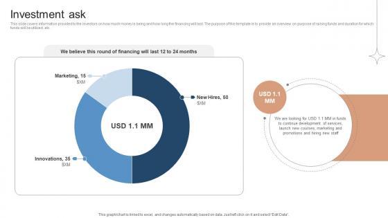 This slide covers information provided to the investors on how much money is being and how long the financing will last. The purpose of this template is to provide an overview on purpose of raising funds and duration for which funds will be utilized, etc. Find highly impressive Investment Ask Investor Funding Elevator Pitch Deck For Online Learning Platform on Slidegeeks to deliver a meaningful presentation. You can save an ample amount of time using these presentation templates. No need to worry to prepare everything from scratch because Slidegeeks experts have already done a huge research and work for you. You need to download Investment Ask Investor Funding Elevator Pitch Deck For Online Learning Platform for your upcoming presentation. All the presentation templates are 100 percent editable and you can change the color and personalize the content accordingly. Download now This slide covers information provided to the investors on how much money is being and how long the financing will last. The purpose of this template is to provide an overview on purpose of raising funds and duration for which funds will be utilized, etc.