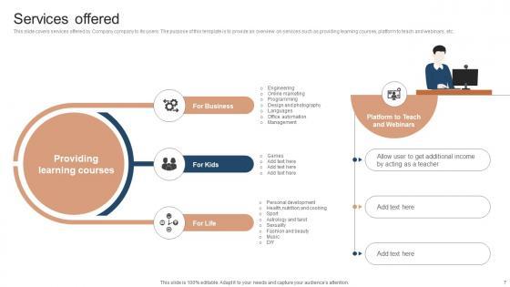 This slide covers services offered by Company company to its users. The purpose of this template is to provide an overview on services such as providing learning courses, platform to teach and webinars, etc. This modern and well-arranged Services Offered Investor Funding Elevator Pitch Deck For Online Learning Platform provides lots of creative possibilities. It is very simple to customize and edit with the Powerpoint Software. Just drag and drop your pictures into the shapes. All facets of this template can be edited with Powerpoint, no extra software is necessary. Add your own material, put your images in the places assigned for them, adjust the colors, and then you can show your slides to the world, with an animated slide included. This slide covers services offered by Company company to its users. The purpose of this template is to provide an overview on services such as providing learning courses, platform to teach and webinars, etc.