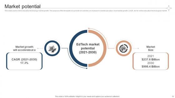 This slide covers online education technology market growth. The purpose of this template is to provide an overview on increase in market size value, incremental growth, CAGR, etc for online education technological market. Are you in need of a template that can accommodate all of your creative concepts This one is crafted professionally and can be altered to fit any style. Use it with Google Slides or PowerPoint. Include striking photographs, symbols, depictions, and other visuals. Fill, move around, or remove text boxes as desired. Test out color palettes and font mixtures. Edit and save your work, or work with colleagues. Download Market Potential Investor Funding Elevator Pitch Deck For Online Learning Platform and observe how to make your presentation outstanding. Give an impeccable presentation to your group and make your presentation unforgettable. This slide covers online education technology market growth. The purpose of this template is to provide an overview on increase in market size value, incremental growth, CAGR, etc for online education technological market.