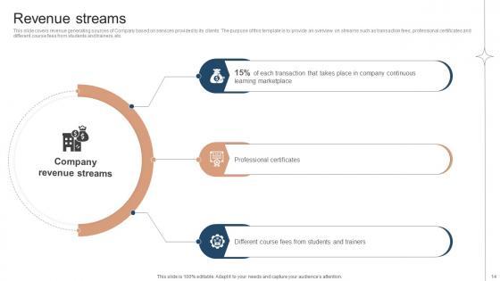 This slide covers revenue generating sources of Company based on services provided to its clients. The purpose of this template is to provide an overview on streams such as transaction fees, professional certificates and different course fees from students and trainers, etc. Coming up with a presentation necessitates that the majority of the effort goes into the content and the message you intend to convey. The visuals of a PowerPoint presentation can only be effective if it supplements and supports the story that is being told. Keeping this in mind our experts created Revenue Streams Investor Funding Elevator Pitch Deck For Online Learning Platform to reduce the time that goes into designing the presentation. This way, you can concentrate on the message while our designers take care of providing you with the right template for the situation. This slide covers revenue generating sources of Company based on services provided to its clients. The purpose of this template is to provide an overview on streams such as transaction fees, professional certificates and different course fees from students and trainers, etc.