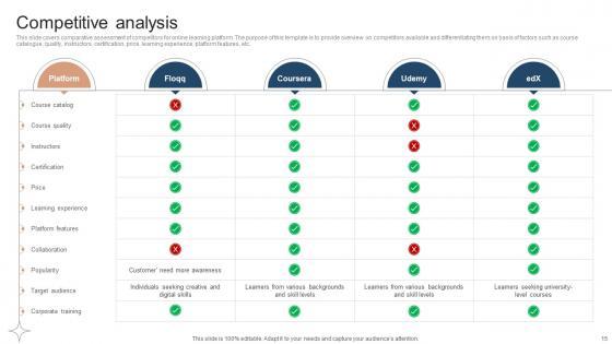 This slide covers comparative assessment of competitors for online learning platform. The purpose of this template is to provide overview on competitors available and differentiating them on basis of factors such as course catalogue, quality, instructors, certification, price, learning experience, platform features, etc. Want to ace your presentation in front of a live audience Our Competitive Analysis Investor Funding Elevator Pitch Deck For Online Learning Platform can help you do that by engaging all the users towards you. Slidegeeks experts have put their efforts and expertise into creating these impeccable powerpoint presentations so that you can communicate your ideas clearly. Moreover, all the templates are customizable, and easy-to-edit and downloadable. Use these for both personal and commercial use. This slide covers comparative assessment of competitors for online learning platform. The purpose of this template is to provide overview on competitors available and differentiating them on basis of factors such as course catalogue, quality, instructors, certification, price, learning experience, platform features, etc.