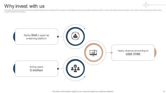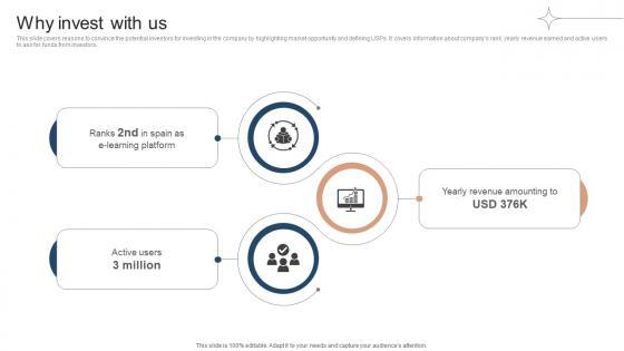 This slide covers reasons to convince the potential investors for investing in the company by highlighting market opportunity and defining USPs. It covers information about companys rank, yearly revenue earned and active users to ask for funds from investors. The best PPT templates are a great way to save time, energy, and resources. Slidegeeks have 100 percent editable powerpoint slides making them incredibly versatile. With these quality presentation templates, you can create a captivating and memorable presentation by combining visually appealing slides and effectively communicating your message. Download Why Invest With Us Investor Funding Elevator Pitch Deck For Online Learning Platform from Slidegeeks and deliver a wonderful presentation. This slide covers reasons to convince the potential investors for investing in the company by highlighting market opportunity and defining USPs. It covers information about companys rank, yearly revenue earned and active users to ask for funds from investors.
