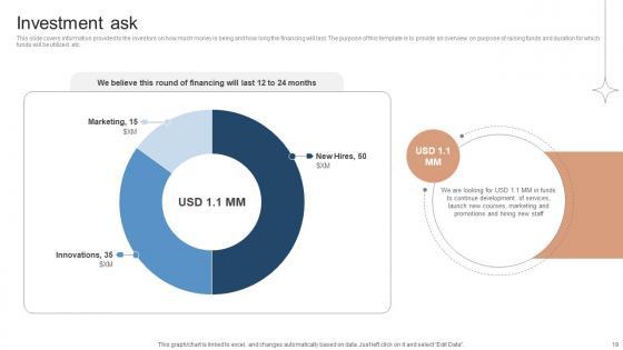 This Investor Funding Elevator Pitch Deck For Online Learning Platform Ppt Template is designed to help you retain your audiences attention. This content-ready PowerPoint Template enables you to take your audience on a journey and share information in a way that is easier to recall. It helps you highlight the crucial parts of your work so that the audience does not get saddled with information download. This thirty four slide PPT Deck comes prepared with the graphs and charts you could need to showcase your information through visuals. You only need to enter your own data in them. Download this editable PowerPoint Theme and walk into that meeting with confidence. Our Investor Funding Elevator Pitch Deck For Online Learning Platform Ppt Template are topically designed to provide an attractive backdrop to any subject. Use them to look like a presentation pro.