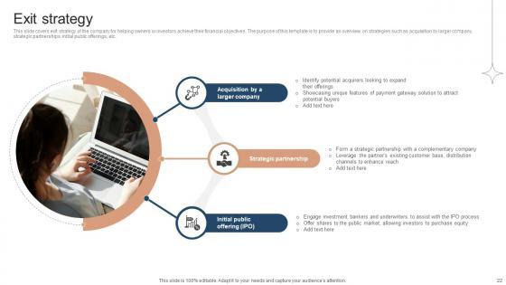 This slide covers exit strategy of the company for helping owners or investors achieve their financial objectives. The purpose of this template is to provide an overview on strategies such as acquisition by larger company, strategic partnerships, initial public offerings, etc. From laying roadmaps to briefing everything in detail, our templates are perfect for you. You can set the stage with your presentation slides. All you have to do is download these easy-to-edit and customizable templates. Exit Strategy Investor Funding Elevator Pitch Deck For Online Learning Platform will help you deliver an outstanding performance that everyone would remember and praise you for. Do download this presentation today. This slide covers exit strategy of the company for helping owners or investors achieve their financial objectives. The purpose of this template is to provide an overview on strategies such as acquisition by larger company, strategic partnerships, initial public offerings, etc.