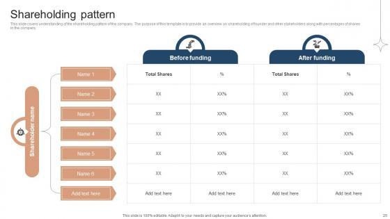 This slide covers understanding of the shareholding pattern of the company. The purpose of this template is to provide an overview on shareholding of founder and other stakeholders along with percentages of shares in the company. This Shareholding Pattern Investor Funding Elevator Pitch Deck For Online Learning Platform is perfect for any presentation, be it in front of clients or colleagues. It is a versatile and stylish solution for organizing your meetings. The Shareholding Pattern Investor Funding Elevator Pitch Deck For Online Learning Platform features a modern design for your presentation meetings. The adjustable and customizable slides provide unlimited possibilities for acing up your presentation. Slidegeeks has done all the homework before launching the product for you. So, do not wait, grab the presentation templates today This slide covers understanding of the shareholding pattern of the company. The purpose of this template is to provide an overview on shareholding of founder and other stakeholders along with percentages of shares in the company.