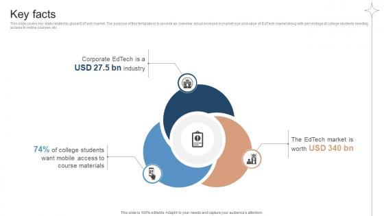 This slide covers key stats related to global EdTech market. The purpose of this template is to provide an overview about increase in market size and value of EdTech market along with percentage of college students needing access to online courses, etc. If your project calls for a presentation, then Slidegeeks is your go-to partner because we have professionally designed, easy-to-edit templates that are perfect for any presentation. After downloading, you can easily edit Key Facts Investor Funding Elevator Pitch Deck For Online Learning Platform and make the changes accordingly. You can rearrange slides or fill them with different images. Check out all the handy templates This slide covers key stats related to global EdTech market. The purpose of this template is to provide an overview about increase in market size and value of EdTech market along with percentage of college students needing access to online courses, etc.