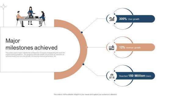 This slide covers major milestones achieved by Company in expanding its reach for online learning platform. The purpose of this template is to provide an overview on achievements such as user growth, increasing revenue generation, etc. If you are looking for a format to display your unique thoughts, then the professionally designed Major Milestones Achieved Investor Funding Elevator Pitch Deck For Online Learning Platform is the one for you. You can use it as a Google Slides template or a PowerPoint template. Incorporate impressive visuals, symbols, images, and other charts. Modify or reorganize the text boxes as you desire. Experiment with shade schemes and font pairings. Alter, share or cooperate with other people on your work. Download Major Milestones Achieved Investor Funding Elevator Pitch Deck For Online Learning Platform and find out how to give a successful presentation. Present a perfect display to your team and make your presentation unforgettable. This slide covers major milestones achieved by Company in expanding its reach for online learning platform. The purpose of this template is to provide an overview on achievements such as user growth, increasing revenue generation, etc.