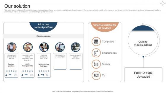 This slide covers solutions offered by Company in solving issues faced by users in searching for relevant courses . The purpose of this template is to provide an overview on solutions such as providing all in one content platform, availability of videos for all devices and uploading of quality videos, etc. Make sure to capture your audiences attention in your business displays with our gratis customizable Our Solution Investor Funding Elevator Pitch Deck For Online Learning Platform. These are great for business strategies, office conferences, capital raising or task suggestions. If you desire to acquire more customers for your tech business and ensure they stay satisfied, create your own sales presentation with these plain slides. This slide covers solutions offered by Company in solving issues faced by users in searching for relevant courses . The purpose of this template is to provide an overview on solutions such as providing all in one content platform, availability of videos for all devices and uploading of quality videos, etc.
