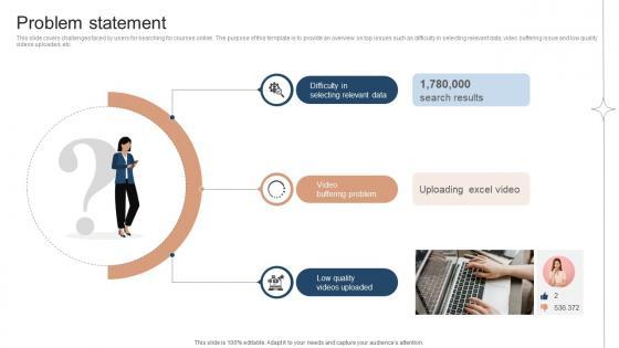 This slide covers challenges faced by users for searching for courses online . The purpose of this template is to provide an overview on top issues such as difficulty in selecting relevant data, video buffering issue and low quality videos uploaded, etc. Formulating a presentation can take up a lot of effort and time, so the content and message should always be the primary focus. The visuals of the PowerPoint can enhance the presenters message, so our Problem Statement Investor Funding Elevator Pitch Deck For Online Learning Platform was created to help save time. Instead of worrying about the design, the presenter can concentrate on the message while our designers work on creating the ideal templates for whatever situation is needed. Slidegeeks has experts for everything from amazing designs to valuable content, we have put everything into Problem Statement Investor Funding Elevator Pitch Deck For Online Learning Platform This slide covers challenges faced by users for searching for courses online . The purpose of this template is to provide an overview on top issues such as difficulty in selecting relevant data, video buffering issue and low quality videos uploaded, etc.
