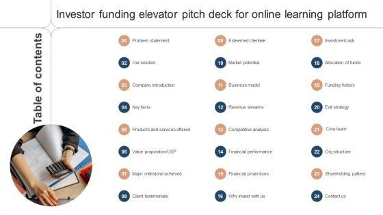 Welcome to our selection of the Table Of Contents Investor Funding Elevator Pitch Deck For Online Learning Platform. These are designed to help you showcase your creativity and bring your sphere to life. Planning and Innovation are essential for any business that is just starting out. This collection contains the designs that you need for your everyday presentations. All of our PowerPoints are 100Percent editable, so you can customize them to suit your needs. This multi-purpose template can be used in various situations. Grab these presentation templates today. Our Table Of Contents Investor Funding Elevator Pitch Deck For Online Learning Platform are topically designed to provide an attractive backdrop to any subject. Use them to look like a presentation pro.