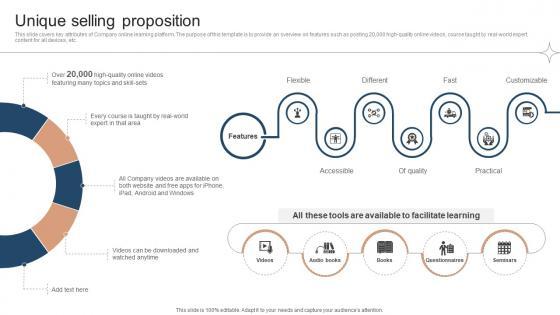 This slide covers key attributes of Company online learning platform. The purpose of this template is to provide an overview on features such as posting 20,000 high-quality online videos, course taught by real-world expert, content for all devices, etc. Explore a selection of the finest Unique Selling Proposition Investor Funding Elevator Pitch Deck For Online Learning Platform here. With a plethora of professionally designed and pre-made slide templates, you can quickly and easily find the right one for your upcoming presentation. You can use our Unique Selling Proposition Investor Funding Elevator Pitch Deck For Online Learning Platform to effectively convey your message to a wider audience. Slidegeeks has done a lot of research before preparing these presentation templates. The content can be personalized and the slides are highly editable. Grab templates today from Slidegeeks. This slide covers key attributes of Company online learning platform. The purpose of this template is to provide an overview on features such as posting 20,000 high-quality online videos, course taught by real-world expert, content for all devices, etc.