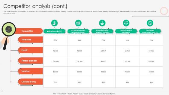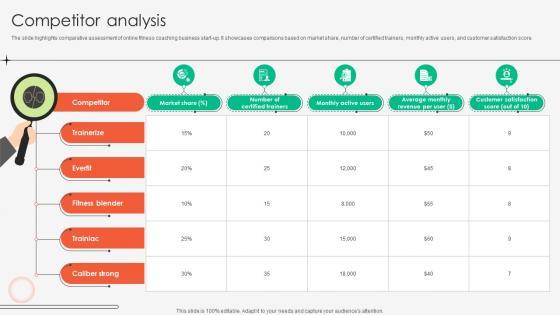 The slide highlights comparative assessment of online fitness coaching business start-up. It showcases comparisons based on market share, number of certified trainers, monthly active users, and customer satisfaction score.Find highly impressive Competitor Analysis Online Fitness Tutoring Business Market Entry Plan GTM SS V on Slidegeeks to deliver a meaningful presentation. You can save an ample amount of time using these presentation templates. No need to worry to prepare everything from scratch because Slidegeeks experts have already done a huge research and work for you. You need to download Competitor Analysis Online Fitness Tutoring Business Market Entry Plan GTM SS V for your upcoming presentation. All the presentation templates are 100 percent editable and you can change the color and personalize the content accordingly. Download now The slide highlights comparative assessment of online fitness coaching business start-up. It showcases comparisons based on market share, number of certified trainers, monthly active users, and customer satisfaction score.