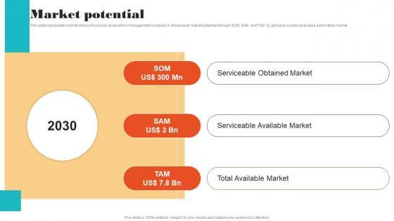 This slide represents market share of Accounts receivables management company. It showcases market potential through SOM, SAM and TAM by global accounts receivable automation market. If you are looking for a format to display your unique thoughts, then the professionally designed Market Potential Online Financial Management Funding Elevator Ideas Pdf is the one for you. You can use it as a Google Slides template or a PowerPoint template. Incorporate impressive visuals, symbols, images, and other charts. Modify or reorganize the text boxes as you desire. Experiment with shade schemes and font pairings. Alter, share or cooperate with other people on your work. Download Market Potential Online Financial Management Funding Elevator Ideas Pdf and find out how to give a successful presentation. Present a perfect display to your team and make your presentation unforgettable. This slide represents market share of Accounts receivables management company. It showcases market potential through SOM, SAM and TAM by global accounts receivable automation market.