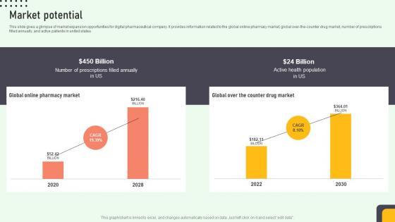 This slide gives a glimpse of market expansion opportunities for digital pharmaceutical company. It provides information related to the global online pharmacy market, global over-the-counter drug market, number of prescriptions filled annually, and active patients in united states. Welcome to our selection of the Market Potential Online Medication Management Platform Pitch Deck. These are designed to help you showcase your creativity and bring your sphere to life. Planning and Innovation are essential for any business that is just starting out. This collection contains the designs that you need for your everyday presentations. All of our PowerPoints are 100Percent editable, so you can customize them to suit your needs. This multi-purpose template can be used in various situations. Grab these presentation templates today. This slide gives a glimpse of market expansion opportunities for digital pharmaceutical company. It provides information related to the global online pharmacy market, global over-the-counter drug market, number of prescriptions filled annually, and active patients in united states.
