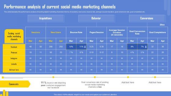 This slide tabulates the performance analysis of existing digital marketing channels in terms of sessions, new users, bounce rate, average session duration, goal conversion rate, goal completions etc. Make sure to capture your audiences attention in your business displays with our gratis customizable Optimizing Twitter For Online Performance Analysis Of Current Social Media Marketing Channels Sample Pdf These are great for business strategies, office conferences, capital raising or task suggestions. If you desire to acquire more customers for your tech business and ensure they stay satisfied, create your own sales presentation with these plain slides. This slide tabulates the performance analysis of existing digital marketing channels in terms of sessions, new users, bounce rate, average session duration, goal conversion rate, goal completions etc.