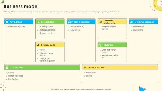 Following slide showcases business model of company. It includes elements such as key partners, activities, resources, customer relationships, segments, cost structure etc. Whether you have daily or monthly meetings, a brilliant presentation is necessary. Business Model Sales Pitch Deck For Online Retail Ppt Sample can be your best option for delivering a presentation. Represent everything in detail using Business Model Sales Pitch Deck For Online Retail Ppt Sample and make yourself stand out in meetings. The template is versatile and follows a structure that will cater to your requirements. All the templates prepared by Slidegeeks are easy to download and edit. Our research experts have taken care of the corporate themes as well. So, give it a try and see the results. Following slide showcases business model of company. It includes elements such as key partners, activities, resources, customer relationships, segments, cost structure etc.
