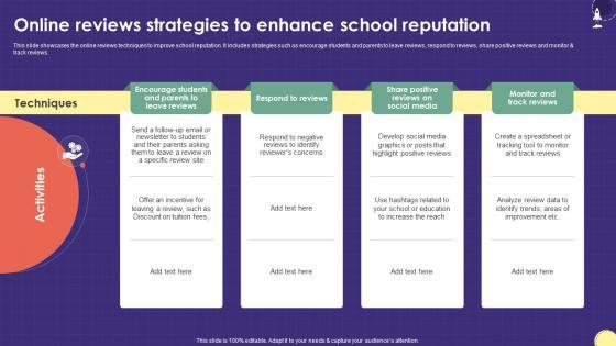 This slide showcases the online reviews techniques to improve school reputation. It includes strategies such as encourage students and parents to leave reviews, respond to reviews, share positive reviews and monitor and track reviews. The best PPT templates are a great way to save time, energy, and resources. Slidegeeks have 100 percent editable powerpoint slides making them incredibly versatile. With these quality presentation templates, you can create a captivating and memorable presentation by combining visually appealing slides and effectively communicating your message. Download Online Reviews Strategies To Enhance School Marketing Plan For Boosting School Strategy SS V from Slidegeeks and deliver a wonderful presentation. This slide showcases the online reviews techniques to improve school reputation. It includes strategies such as encourage students and parents to leave reviews, respond to reviews, share positive reviews and monitor and track reviews.