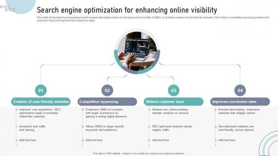 This slide showcases how leveraging search engine optimization helps in improving online visibility of SMEs. It includes creation of user friendly websites, SEO help in competition bypassing, widens the customer base and improves the conversion rates.Retrieve professionally designed Search Engine Optimization For Enhancing Online Visibility DT SS V to effectively convey your message and captivate your listeners. Save time by selecting pre-made slideshows that are appropriate for various topics, from business to educational purposes. These themes come in many different styles, from creative to corporate, and all of them are easily adjustable and can be edited quickly. Access them as PowerPoint templates or as Google Slides themes. You do not have to go on a hunt for the perfect presentation because Slidegeeks got you covered from everywhere. This slide showcases how leveraging search engine optimization helps in improving online visibility of SMEs. It includes creation of user friendly websites, SEO help in competition bypassing, widens the customer base and improves the conversion rates.