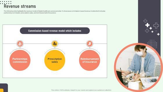 The following slide highlights the revenue model of digital healthcare service provider. It showcases commission based revenue model which includes partnership commission, prescription sales, and reimbursement of insurance. Retrieve professionally designed Revenue Streams Online Medication Management Platform Pitch Deck to effectively convey your message and captivate your listeners. Save time by selecting pre-made slideshows that are appropriate for various topics, from business to educational purposes. These themes come in many different styles, from creative to corporate, and all of them are easily adjustable and can be edited quickly. Access them as PowerPoint templates or as Google Slides themes. You do not have to go on a hunt for the perfect presentation because Slidegeeks got you covered from everywhere. The following slide highlights the revenue model of digital healthcare service provider. It showcases commission based revenue model which includes partnership commission, prescription sales, and reimbursement of insurance.
