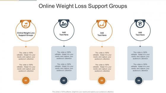 Introducing our well designed Online Weight Loss Support Groups In Powerpoint And Google Slides Cpb. This PowerPoint design presents information on topics like Online Weight Loss Support Groups. As it is predesigned it helps boost your confidence level. It also makes you a better presenter because of its high quality content and graphics. This PPT layout can be downloaded and used in different formats like PDF, PNG, and JPG. Not only this, it is available in both Standard Screen and Widescreen aspect ratios for your convenience. Therefore, click on the download button now to persuade and impress your audience. Our Online Weight Loss Support Groups In Powerpoint And Google Slides Cpb are topically designed to provide an attractive backdrop to any subject. Use them to look like a presentation pro.