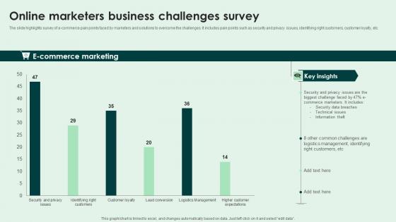 The slide highlights survey of e-commerce pain points faced by marketers and solutions to overcome the challenges. It includes pain points such as security and privacy issues, identifying right customers, customer loyalty, etc. Pitch your topic with ease and precision using this Online Marketers Business Challenges Survey Slides Pdf. This layout presents information on E Commerce Marketing. It is also available for immediate download and adjustment. So, changes can be made in the color, design, graphics or any other component to create a unique layout. The slide highlights survey of e-commerce pain points faced by marketers and solutions to overcome the challenges. It includes pain points such as security and privacy issues, identifying right customers, customer loyalty, etc.