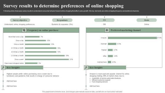 Following slide showcases survey results to understand consumer behavior toward online shopping that affect sales growth. It its key elements are online shopping frequency and preferred channels. Create an editable Survey Results To Determine Preferences Of Online Efficient Marketing Tactics Template Pdf that communicates your idea and engages your audience. Whether you are presenting a business or an educational presentation, pre-designed presentation templates help save time. Survey Results To Determine Preferences Of Online Efficient Marketing Tactics Template Pdf is highly customizable and very easy to edit, covering many different styles from creative to business presentations. Slidegeeks has creative team members who have crafted amazing templates. So, go and get them without any delay. Following slide showcases survey results to understand consumer behavior toward online shopping that affect sales growth. It its key elements are online shopping frequency and preferred channels.
