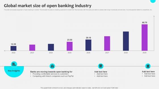This slide showcases expansion of open banking in market. This template focuses on enabling customers to share their financial data with third party providers to access wide range of products and services. It covers aspects related to competitors, etc. If you are looking for a format to display your unique thoughts, then the professionally designed Global Market Size Of Open Initiating Globalization Of Banking Ppt Template is the one for you. You can use it as a Google Slides template or a PowerPoint template. Incorporate impressive visuals, symbols, images, and other charts. Modify or reorganize the text boxes as you desire. Experiment with shade schemes and font pairings. Alter, share or cooperate with other people on your work. Download Global Market Size Of Open Initiating Globalization Of Banking Ppt Template and find out how to give a successful presentation. Present a perfect display to your team and make your presentation unforgettable. This slide showcases expansion of open banking in market. This template focuses on enabling customers to share their financial data with third party providers to access wide range of products and services. It covers aspects related to competitors, etc.