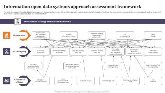 The slide showcases information data systems approach assessment frameworks that assist companies to evaluate factors that affect quality of analytics. The slide contains assessment framework with points such as government dealt activities, company dealt activities, and concerned officer. Pitch your topic with ease and precision using this Information Open Data Systems Approach Assessment Framework Introduction Pdf This layout presents information on Information Strategy, Assessment Framework, Concerned Officials It is also available for immediate download and adjustment. So, changes can be made in the color, design, graphics or any other component to create a unique layout. The slide showcases information data systems approach assessment frameworks that assist companies to evaluate factors that affect quality of analytics. The slide contains assessment framework with points such as government dealt activities, company dealt activities, and concerned officer.