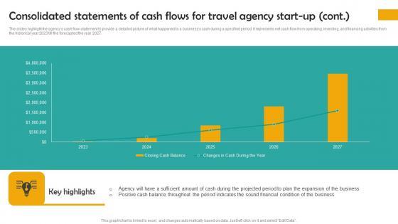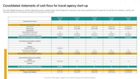 The slides highlight the agencys cash flow statement to provide a detailed picture of what happened to a businesss cash during a specified period. It represents net cash flow from operating, investing, and financing activities from the historical year 2023 till the forecasted the year 2027. Make sure to capture your audiences attention in your business displays with our gratis customizable Consolidated Statements Of Cash Group Tour Operator Business Plan Go To Market Strategy Ideas Pdf. These are great for business strategies, office conferences, capital raising or task suggestions. If you desire to acquire more customers for your tech business and ensure they stay satisfied, create your own sales presentation with these plain slides. The slides highlight the agencys cash flow statement to provide a detailed picture of what happened to a businesss cash during a specified period. It represents net cash flow from operating, investing, and financing activities from the historical year 2023 till the forecasted the year 2027.
