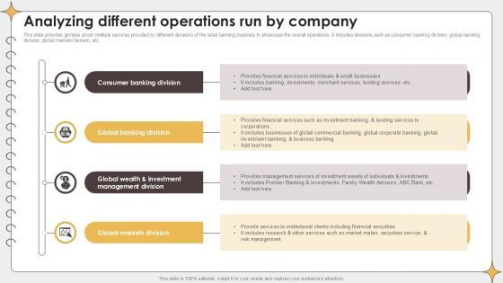 This slide provides glimpse about multiple services provided by different divisions of the retail banking business to showcase the overall operations. It includes divisions such as consumer banking division, global banking division, global markets division, etc. Slidegeeks is one of the best resources for PowerPoint templates. You can download easily and regulate Analyzing Different Operations Planning Outreach Campaigns PPT PowerPoint for your personal presentations from our wonderful collection. A few clicks is all it takes to discover and get the most relevant and appropriate templates. Use our Templates to add a unique zing and appeal to your presentation and meetings. All the slides are easy to edit and you can use them even for advertisement purposes. This slide provides glimpse about multiple services provided by different divisions of the retail banking business to showcase the overall operations. It includes divisions such as consumer banking division, global banking division, global markets division, etc.