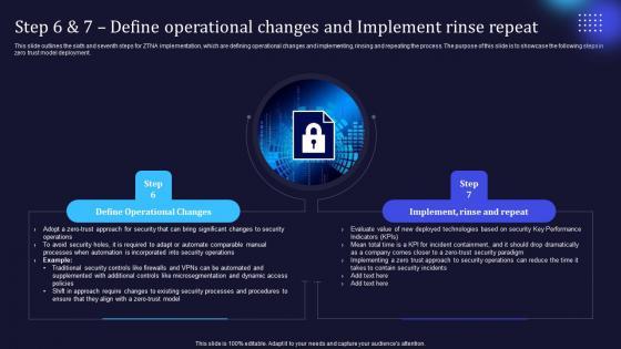 This slide outlines the sixth and seventh steps for ZTNA implementation, which are defining operational changes and implementing, rinsing and repeating the process. The purpose of this slide is to showcase the following steps in zero trust model deployment. Present like a pro with Zero Trust Model Step 6 And 7 Define Operational Changes And Implement. Create beautiful presentations together with your team, using our easy-to-use presentation slides. Share your ideas in real-time and make changes on the fly by downloading our templates. So whether you are in the office, on the go, or in a remote location, you can stay in sync with your team and present your ideas with confidence. With Slidegeeks presentation got a whole lot easier. Grab these presentations today. This slide outlines the sixth and seventh steps for ZTNA implementation, which are defining operational changes and implementing, rinsing and repeating the process. The purpose of this slide is to showcase the following steps in zero trust model deployment.