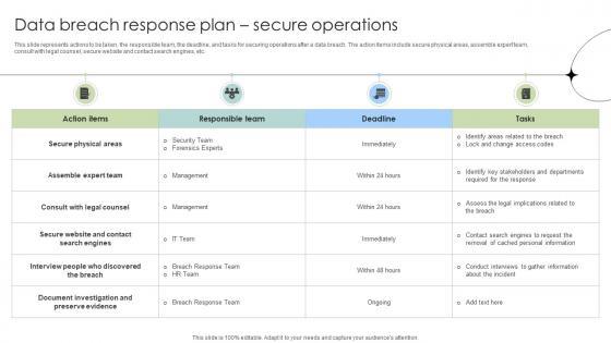 This slide represents actions to be taken, the responsible team, the deadline, and tasks for securing operations after a data breach. The action items include secure physical areas, assemble expert team, consult with legal counsel, secure website and contact search engines, etc. This Data Breach Response Plan Secure Operations Data Fortification Strengthening Defenses is perfect for any presentation, be it in front of clients or colleagues. It is a versatile and stylish solution for organizing your meetings. The Data Breach Response Plan Secure Operations Data Fortification Strengthening Defenses features a modern design for your presentation meetings. The adjustable and customizable slides provide unlimited possibilities for acing up your presentation. Slidegeeks has done all the homework before launching the product for you. So, do not wait, grab the presentation templates today This slide represents actions to be taken, the responsible team, the deadline, and tasks for securing operations after a data breach. The action items include secure physical areas, assemble expert team, consult with legal counsel, secure website and contact search engines, etc.