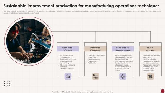 This slide consists of strategies for manufacturing operations to create products by minimizing environmental impacts while conserving energy and natural resources. The key strategies are reduction of waste, reduction in resource usage, substitution of resources and reuse of waste Pitch your topic with ease and precision using this Sustainable Improvement Production For Manufacturing Operations Techniques Sample Pdf This layout presents information on Reduction Of Waste, Substitution Of Resources, Reuse Of Waste It is also available for immediate download and adjustment. So, changes can be made in the color, design, graphics or any other component to create a unique layout. This slide consists of strategies for manufacturing operations to create products by minimizing environmental impacts while conserving energy and natural resources. The key strategies are reduction of waste, reduction in resource usage, substitution of resources and reuse of waste