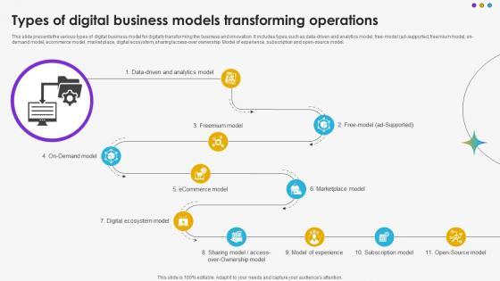 This slide presents the various types of digital business model for digitally transforming the business and innovation. It includes types such as data-driven and analytics model, free-model ad-supported, freemium model, on-demand model, ecommerce model, market place, digital ecosystem, sharing or access-over ownership. Model of experience, subscription and open-source model.If your project calls for a presentation, then Slidegeeks is your go-to partner because we have professionally designed, easy-to-edit templates that are perfect for any presentation. After downloading, you can easily edit Types Of Digital Business Models Transforming Operations DT SS V and make the changes accordingly. You can rearrange slides or fill them with different images. Check out all the handy templates This slide presents the various types of digital business model for digitally transforming the business and innovation. It includes types such as data-driven and analytics model, free-model ad-supported, freemium model, on-demand model, ecommerce model, market place, digital ecosystem, sharing or access-over ownership. Model of experience, subscription and open-source model.