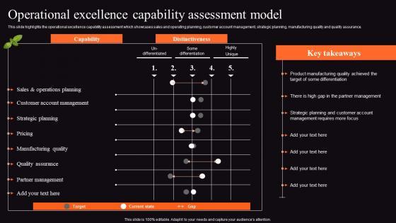 This slide highlights the operational excellence capability assessment which showcases sales and operating planning, customer account management, strategic planning, manufacturing quality and quality assurance. Retrieve professionally designed Operational Excellence Capability Assessment Model Summary PDF to effectively convey your message and captivate your listeners. Save time by selecting pre made slideshows that are appropriate for various topics, from business to educational purposes. These themes come in many different styles, from creative to corporate, and all of them are easily adjustable and can be edited quickly. Access them as PowerPoint templates or as Google Slides themes. You do not have to go on a hunt for the perfect presentation because Slidegeeks got you covered from everywhere.