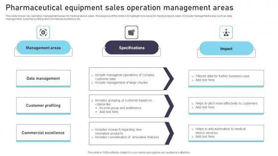 This slide shows key operation management areas for medical device sales. The purpose of this slide is to highlight core areas for medical device sales. It include management areas such as data management, customer profiling and commercial excellence, etc. Pitch your topic with ease and precision using this Pharmaceutical Equipment Sales Operation Management Areas Clipart Pdf. This layout presents information on Management Areas, Specifications, Impact. It is also available for immediate download and adjustment. So, changes can be made in the color, design, graphics or any other component to create a unique layout. This slide shows key operation management areas for medical device sales. The purpose of this slide is to highlight core areas for medical device sales. It include management areas such as data management, customer profiling and commercial excellence, etc.