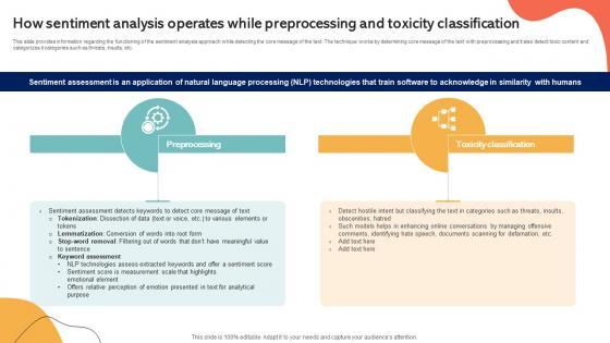 This slide provides information regarding the functioning of the sentiment analysis approach while detecting the core message of the text. The technique works by determining core message of the text with preprocessing and it also detect toxic content and categorizes it categories such as threats, insults, etc. Are you searching for a How Sentiment Analysis Operates While Preprocessing Emotionally Intelligent Insights Leveraging AI SS V that is uncluttered, straightforward, and original Its easy to edit, and you can change the colors to suit your personal or business branding. For a presentation that expresses how much effort you have put in, this template is ideal With all of its features, including tables, diagrams, statistics, and lists, its perfect for a business plan presentation. Make your ideas more appealing with these professional slides. Download How Sentiment Analysis Operates While Preprocessing Emotionally Intelligent Insights Leveraging AI SS V from Slidegeeks today. This slide provides information regarding the functioning of the sentiment analysis approach while detecting the core message of the text. The technique works by determining core message of the text with preprocessing and it also detect toxic content and categorizes it categories such as threats, insults, etc.