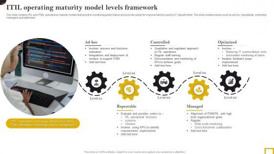 The slide contains ITIL and ITSM operational maturity models that assist in monitoring performance and look into areas for improvement as used by IT departments. The slide contains levels such as ad-hoc, repeatable, controlled, managed, and optimized. Showcasing this set of slides titled ITIL Operating Maturity Model Levels Framework Topics Pdf. The topics addressed in these templates are Repeatable, Controlled, Managed. All the content presented in this PPT design is completely editable. Download it and make adjustments in color, background, font etc. as per your unique business setting. The slide contains ITIL and ITSM operational maturity models that assist in monitoring performance and look into areas for improvement as used by IT departments. The slide contains levels such as ad-hoc, repeatable, controlled, managed, and optimized.