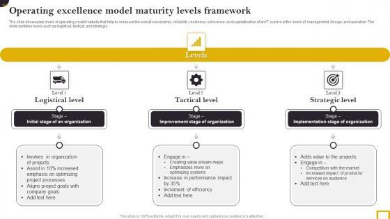 The slide showcases levels of operating model maturity that help to measure the overall consistency, reliability, resilience, coherence, and sophistication of an IT system at the levels of management, design, and operation. The slide contains levels such as logistical, tactical, and strategic. Pitch your topic with ease and precision using this Operating Excellence Model Maturity Levels Framework Introduction Pdf. This layout presents information on Logistical Level, Tactical Level, Strategic Level. It is also available for immediate download and adjustment. So, changes can be made in the color, design, graphics or any other component to create a unique layout. The slide showcases levels of operating model maturity that help to measure the overall consistency, reliability, resilience, coherence, and sophistication of an IT system at the levels of management, design, and operation. The slide contains levels such as logistical, tactical, and strategic.
