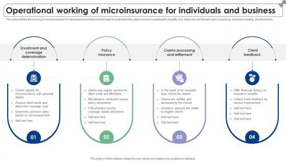 This slide exhibits the working of microinsurance for individuals and enterprise that helps to understand the steps involved in availing the benefits. Key steps are enrollment, policy insurance, claims processing, client feedback. Formulating a presentation can take up a lot of effort and time, so the content and message should always be the primary focus. The visuals of the PowerPoint can enhance the presenters message, so our Operational Working Of Microinsurance For Complete Guide To Microfinance Fin SS V was created to help save time. Instead of worrying about the design, the presenter can concentrate on the message while our designers work on creating the ideal templates for whatever situation is needed. Slidegeeks has experts for everything from amazing designs to valuable content, we have put everything into Operational Working Of Microinsurance For Complete Guide To Microfinance Fin SS V This slide exhibits the working of microinsurance for individuals and enterprise that helps to understand the steps involved in availing the benefits. Key steps are enrollment, policy insurance, claims processing, client feedback.