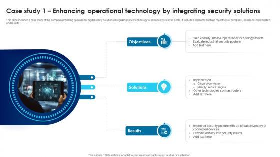 This slide includes a case study of the company providing operational digital safety solutions integrating Cisco technology to enhance visibility at scale. It includes elements such as objectives of company , solutions implemented, and results. Slidegeeks is here to make your presentations a breeze with Building Trust With IoT Security Case Study 1 Enhancing Operational Technology By Integrating IoT SS V With our easy-to-use and customizable templates, you can focus on delivering your ideas rather than worrying about formatting. With a variety of designs to choose from, you are sure to find one that suits your needs. And with animations and unique photos, illustrations, and fonts, you can make your presentation pop. So whether you are giving a sales pitch or presenting to the board, make sure to check out Slidegeeks first This slide includes a case study of the company providing operational digital safety solutions integrating Cisco technology to enhance visibility at scale. It includes elements such as objectives of company , solutions implemented, and results.
