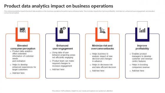 This slide presents the impact of product data analytics on the business operations for performance enhancements. This includes impacts like improve profitability, minimize risk, enhanced user engagement, and elevated consumer perception. Pitch your topic with ease and precision using this Product Data Analytics Impact On Business Operations Elements Pdf. This layout presents information on Elevated Consumer Perception, Enhanced User Engagement, Improve Profitability. It is also available for immediate download and adjustment. So, changes can be made in the color, design, graphics or any other component to create a unique layout. This slide presents the impact of product data analytics on the business operations for performance enhancements. This includes impacts like improve profitability, minimize risk, enhanced user engagement, and elevated consumer perception.