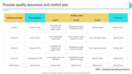 This slide provides glimpse about developing a plan for production control management that can help an organization to check and ensure manufacturing of a quality product. It includes calibration activities, data acquisition, quality control, etc. This Process Quality Assurance Business Performance Optimization New Operations Strategy Icons Pdf from Slidegeeks makes it easy to present information on your topic with precision. It provides customization options, so you can make changes to the colors, design, graphics, or any other component to create a unique layout. It is also available for immediate download, so you can begin using it right away. Slidegeeks has done good research to ensure that you have everything you need to make your presentation stand out. Make a name out there for a brilliant performance. This slide provides glimpse about developing a plan for production control management that can help an organization to check and ensure manufacturing of a quality product. It includes calibration activities, data acquisition, quality control, etc.