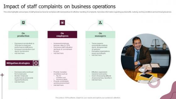 This slide highlights various types of staff grievances faced at workplace with best practices for effective handling of complaints. It provides information regarding pay andbenefits, bullying, working conditions and workload grievances. Pitch your topic with ease and precision using this Impact Of Staff Complaints On Business Operations Background Pdf. This layout presents information on Employees, Production, Managers. It is also available for immediate download and adjustment. So, changes can be made in the color, design, graphics or any other component to create a unique layout. This slide highlights various types of staff grievances faced at workplace with best practices for effective handling of complaints. It provides information regarding pay andbenefits, bullying, working conditions and workload grievances.