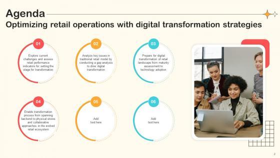 Want to ace your presentation in front of a live audience Our Agenda Optimizing Retail Operations With Digital Transformation Strategies can help you do that by engaging all the users towards you. Slidegeeks experts have put their efforts and expertise into creating these impeccable powerpoint presentations so that you can communicate your ideas clearly. Moreover, all the templates are customizable, and easy-to-edit and downloadable. Use these for both personal and commercial use. Our Agenda Optimizing Retail Operations With Digital Transformation Strategies are topically designed to provide an attractive backdrop to any subject. Use them to look like a presentation pro.