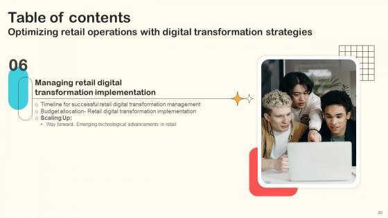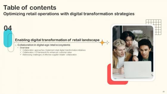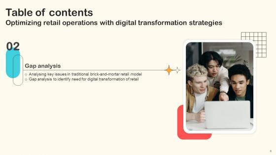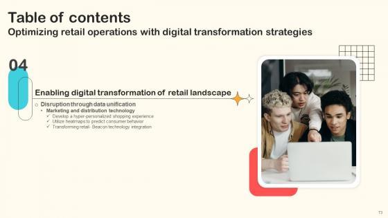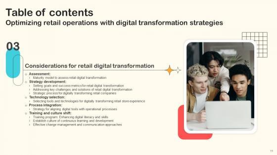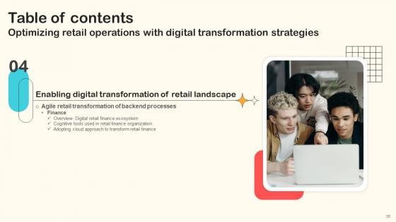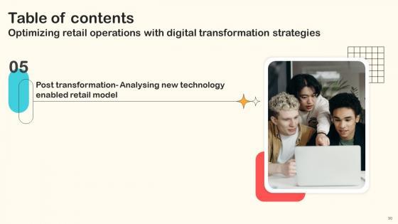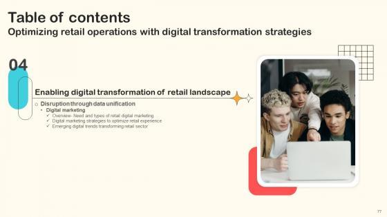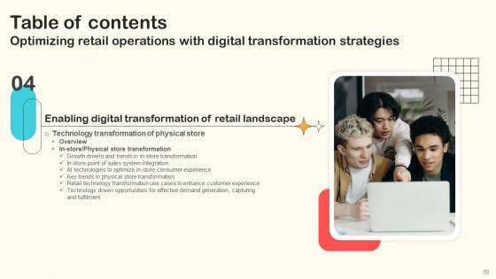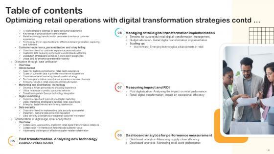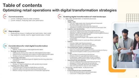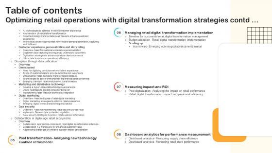 Here you can discover an assortment of the finest PowerPoint and Google Slides templates. With these templates, you can create presentations for a variety of purposes while simultaneously providing your audience with an eye-catching visual experience. Download Table Of Contents Optimizing Retail Operations With Digital Transformation Strategies to deliver an impeccable presentation. These templates will make your job of preparing presentations much quicker, yet still, maintain a high level of quality. Slidegeeks has experienced researchers who prepare these templates and write high-quality content for you. Later on, you can personalize the content by editing the Table Of Contents Optimizing Retail Operations With Digital Transformation Strategies. Our Table Of Contents Optimizing Retail Operations With Digital Transformation Strategies are topically designed to provide an attractive backdrop to any subject. Use them to look like a presentation pro.