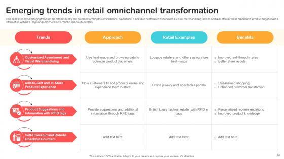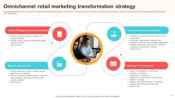 This slide presents steps for a successful omnichannel transformation to optimize client journeys. It includes steps such as define strategy and deisgn principles, map service journeys, invest in foundational enablers, and build out IT architecture.From laying roadmaps to briefing everything in detail, our templates are perfect for you. You can set the stage with your presentation slides. All you have to do is download these easy-to-edit and customizable templates. Omnichannel Retail Marketing Transformation Strategy Optimizing Retail Operations With Digital DT SS V will help you deliver an outstanding performance that everyone would remember and praise you for. Do download this presentation today. This slide presents steps for a successful omnichannel transformation to optimize client journeys. It includes steps such as define strategy and deisgn principles, map service journeys, invest in foundational enablers, and build out IT architecture.