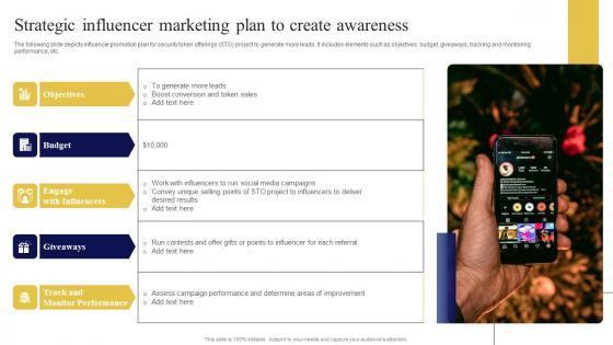 The following slide depicts influencer promotion plan for security token offerings STO project to generate more leads. It includes elements such as objectives, budget, giveaways, tracking and monitoring performance, etc. Slidegeeks has constructed Strategic Influencer Marketing Plan To Create Exploring Investment Opportunities Ideas Pdf after conducting extensive research and examination. These presentation templates are constantly being generated and modified based on user preferences and critiques from editors. Here, you will find the most attractive templates for a range of purposes while taking into account ratings and remarks from users regarding the content. This is an excellent jumping-off point to explore our content and will give new users an insight into our top-notch PowerPoint Templates. The following slide depicts influencer promotion plan for security token offerings STO project to generate more leads. It includes elements such as objectives, budget, giveaways, tracking and monitoring performance, etc.